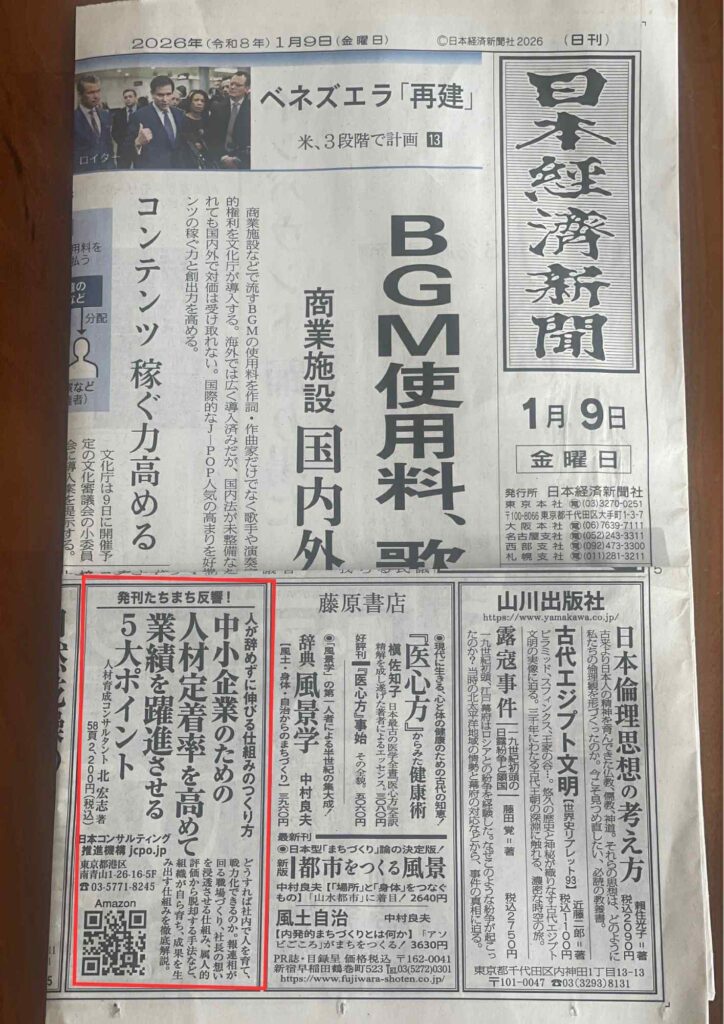 「中小企業のための人材定着率を高めて業績を躍進させる5大ポイント-人が辞めずに伸びる!人材育成の仕組みのつくり方」の広告が掲載されました。